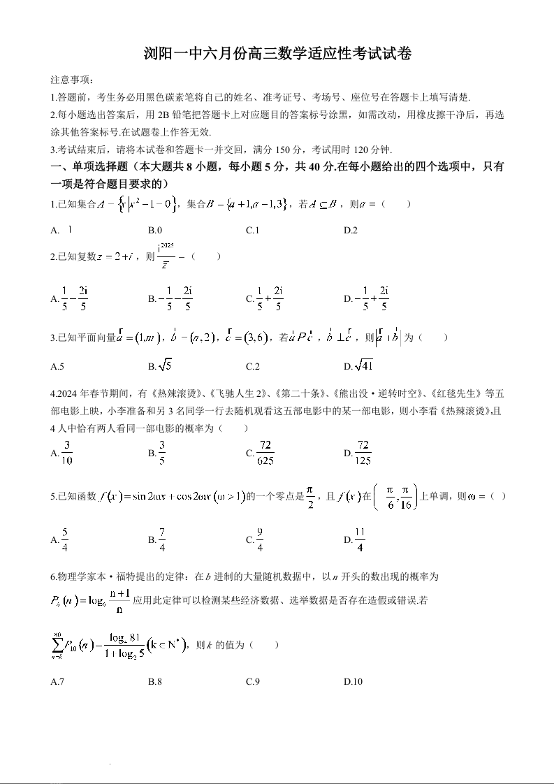 湖南省长沙市浏阳市第一中学2024年6月份高考适应性考试+数学