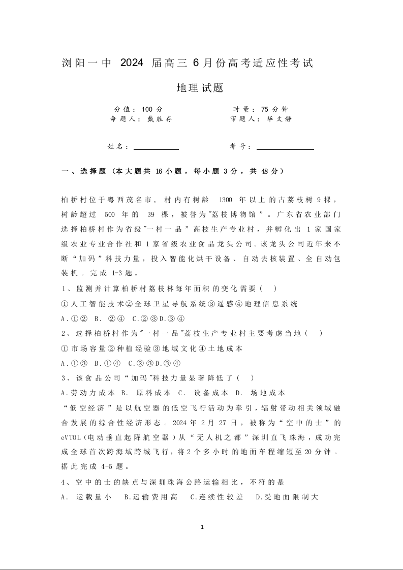 湖南省长沙市浏阳市第一中学2024年6月份高考适应性考试+地理