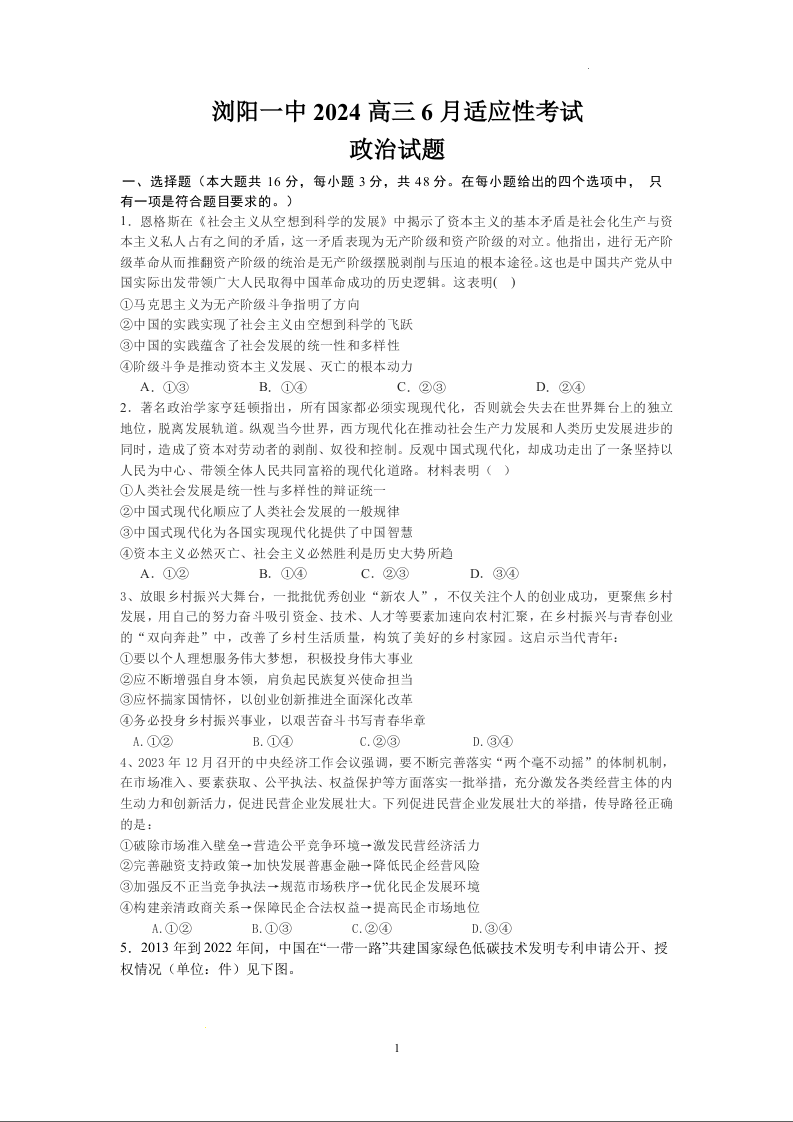 湖南省长沙市浏阳市第一中学2024年6月份高考适应性考试+政治