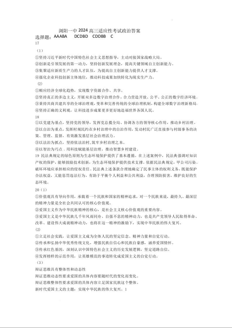 湖南省长沙市浏阳市第一中学2024年6月份高考适应性考试+政治答案