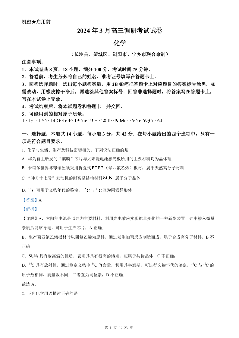湖南省长沙市四区2023-2024学年高三下学期3月调研考试(一模)化学试卷(解析版)