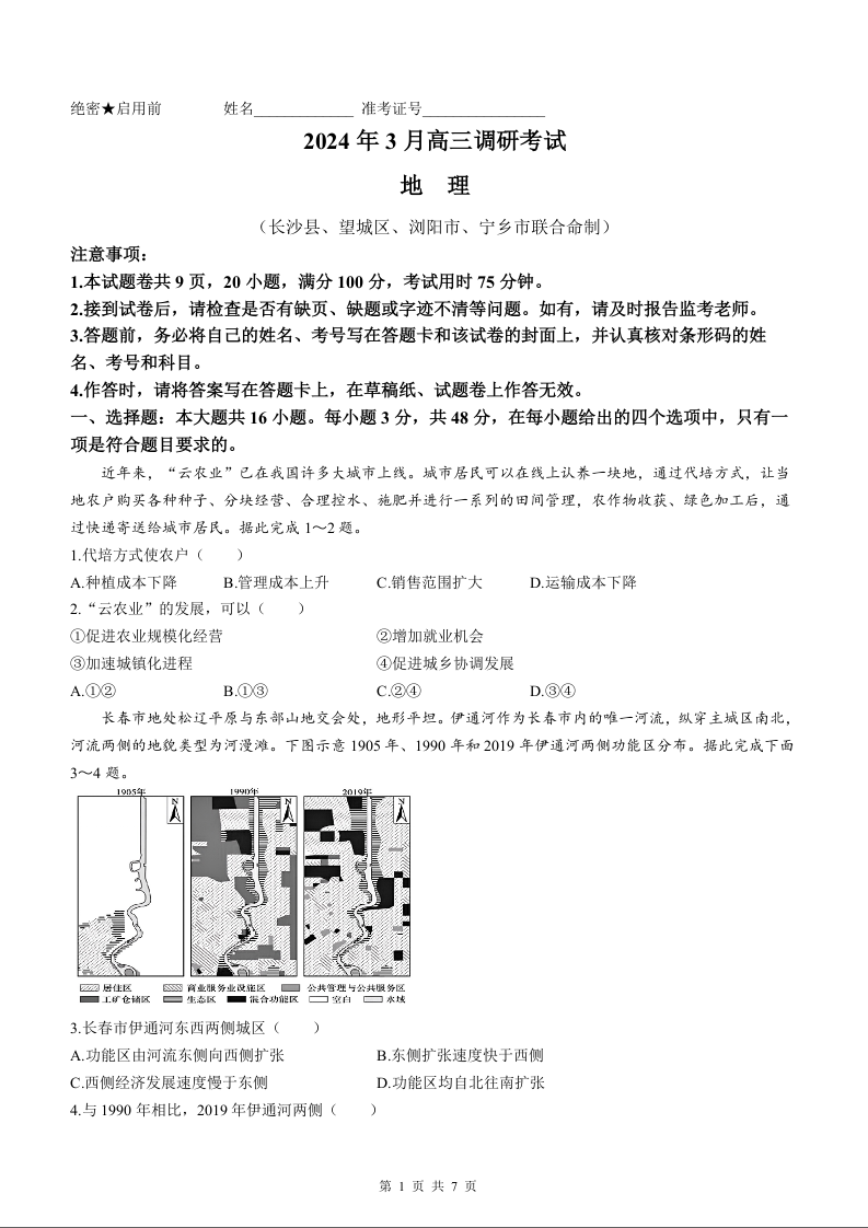 湖南省长沙市长沙县、望城区、浏阳市、宁乡市2024届高三下学期3月调研考试地理试题