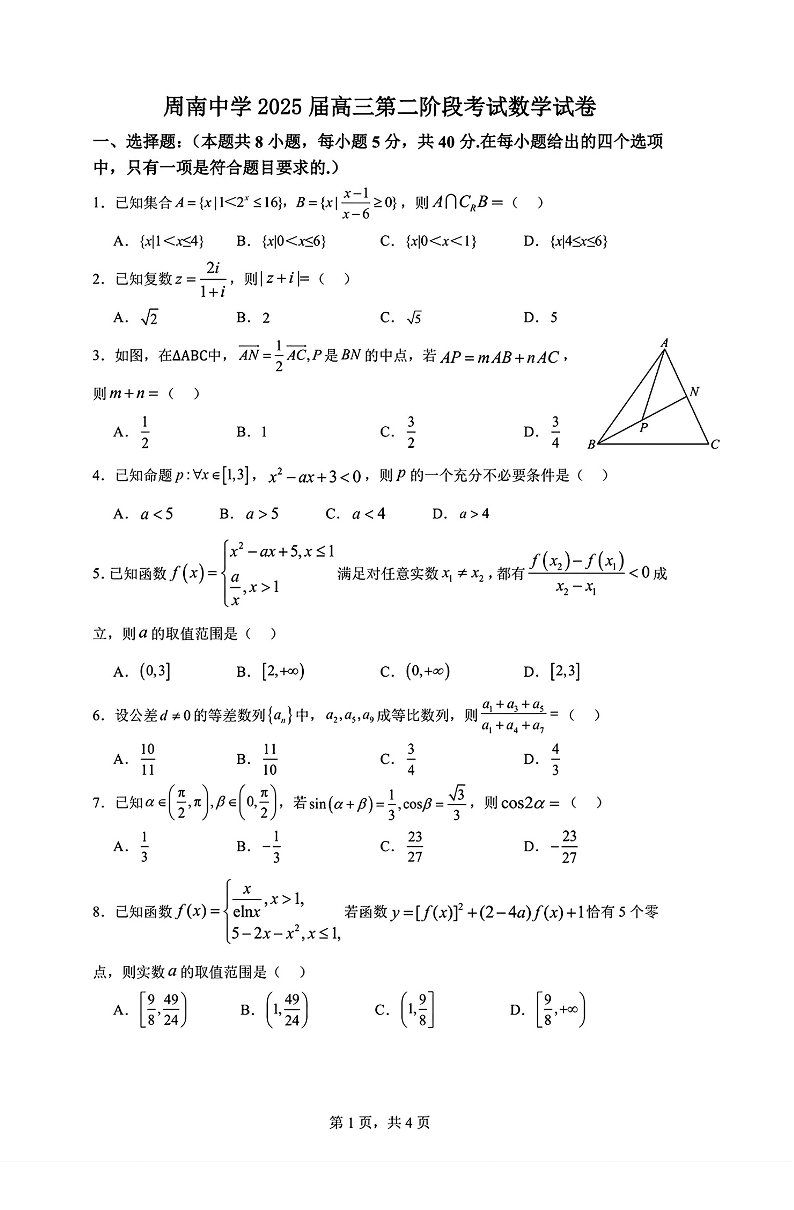湖南省长沙市周南中学2025届高三上学期第二阶段考试+数学