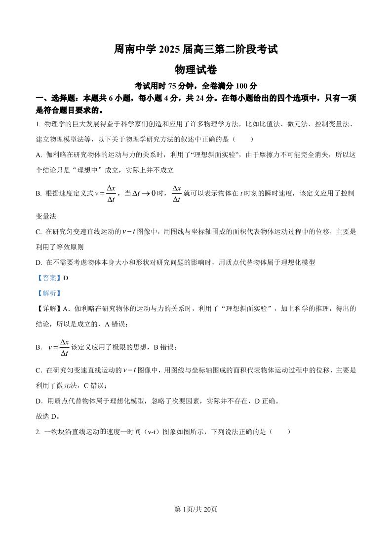 湖南省长沙市周南中学2025届高三上学期第二阶段考试+物理答案