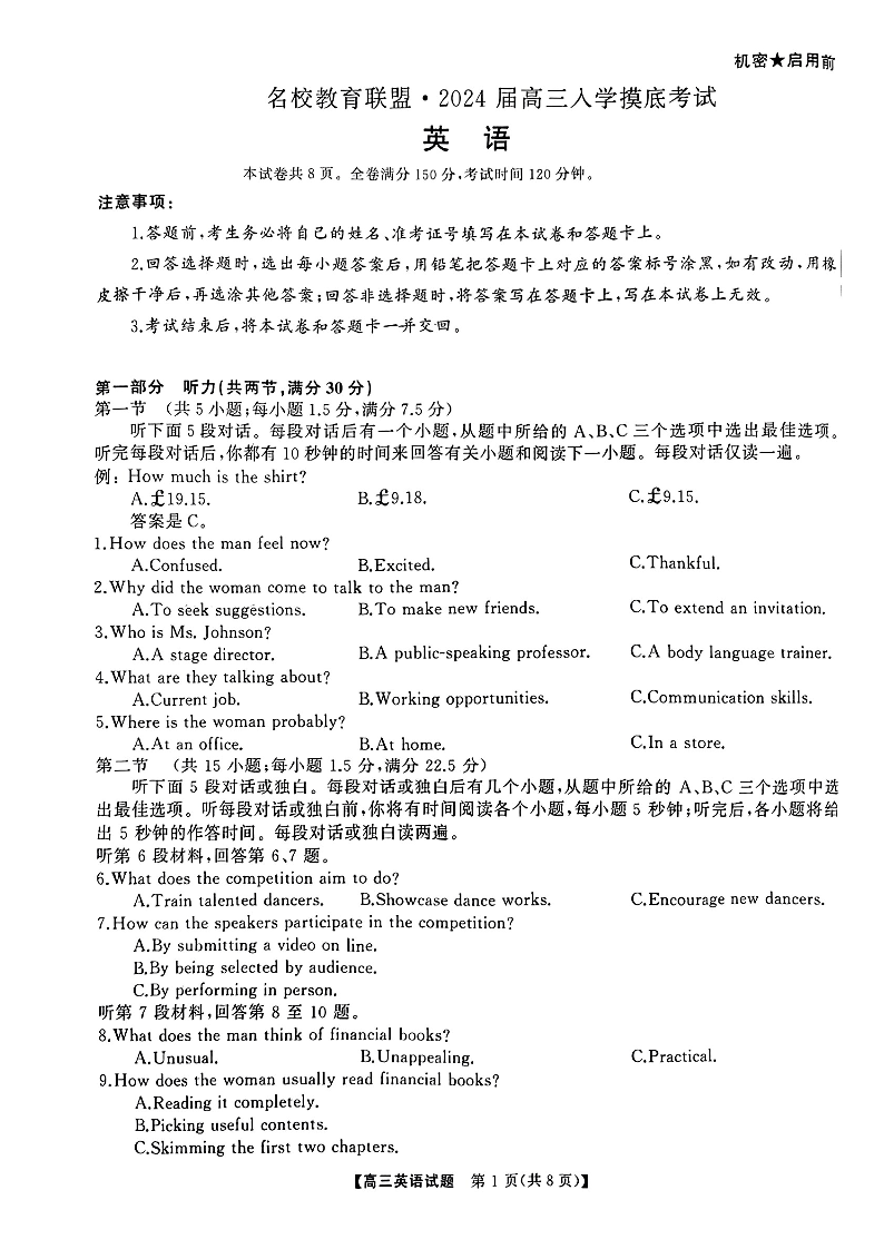 湖南天壹联盟三湘名校2023-2024学年高三下学期入学摸底考试 英语