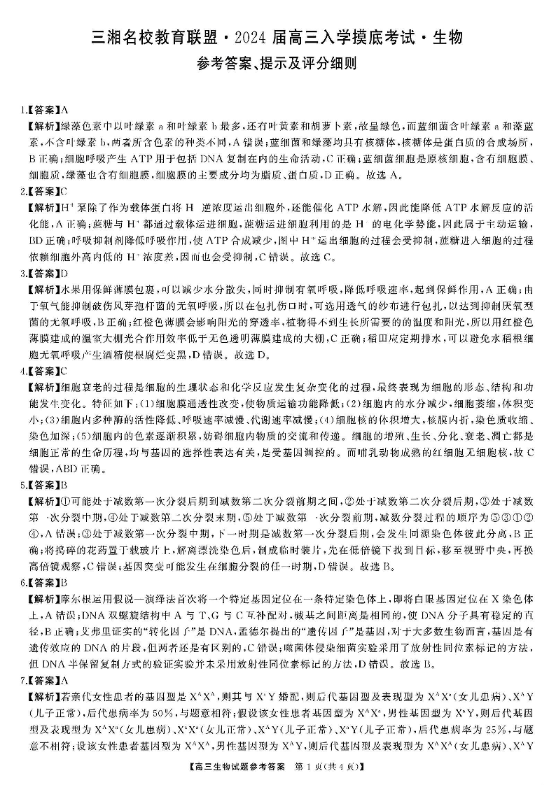 湖南天壹联盟三湘名校2023-2024学年高三下学期入学摸底考试 生物答案