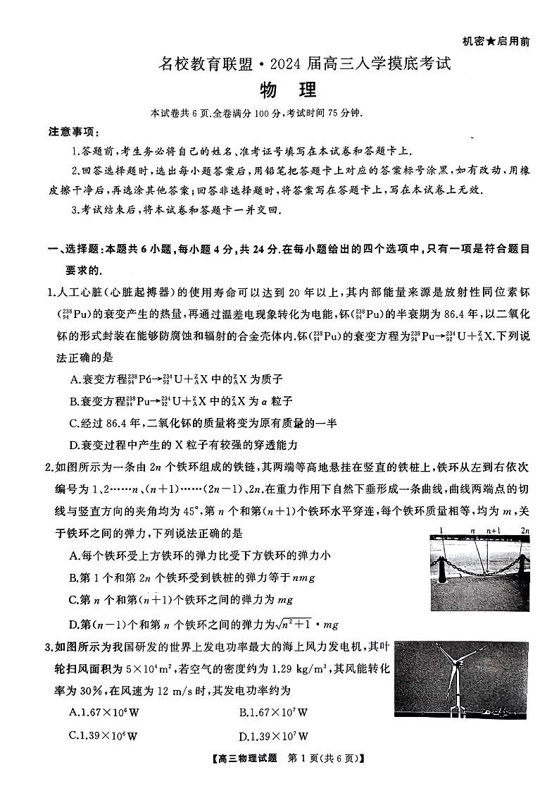 湖南天壹联盟三湘名校2023-2024学年高三下学期入学摸底考试 物理