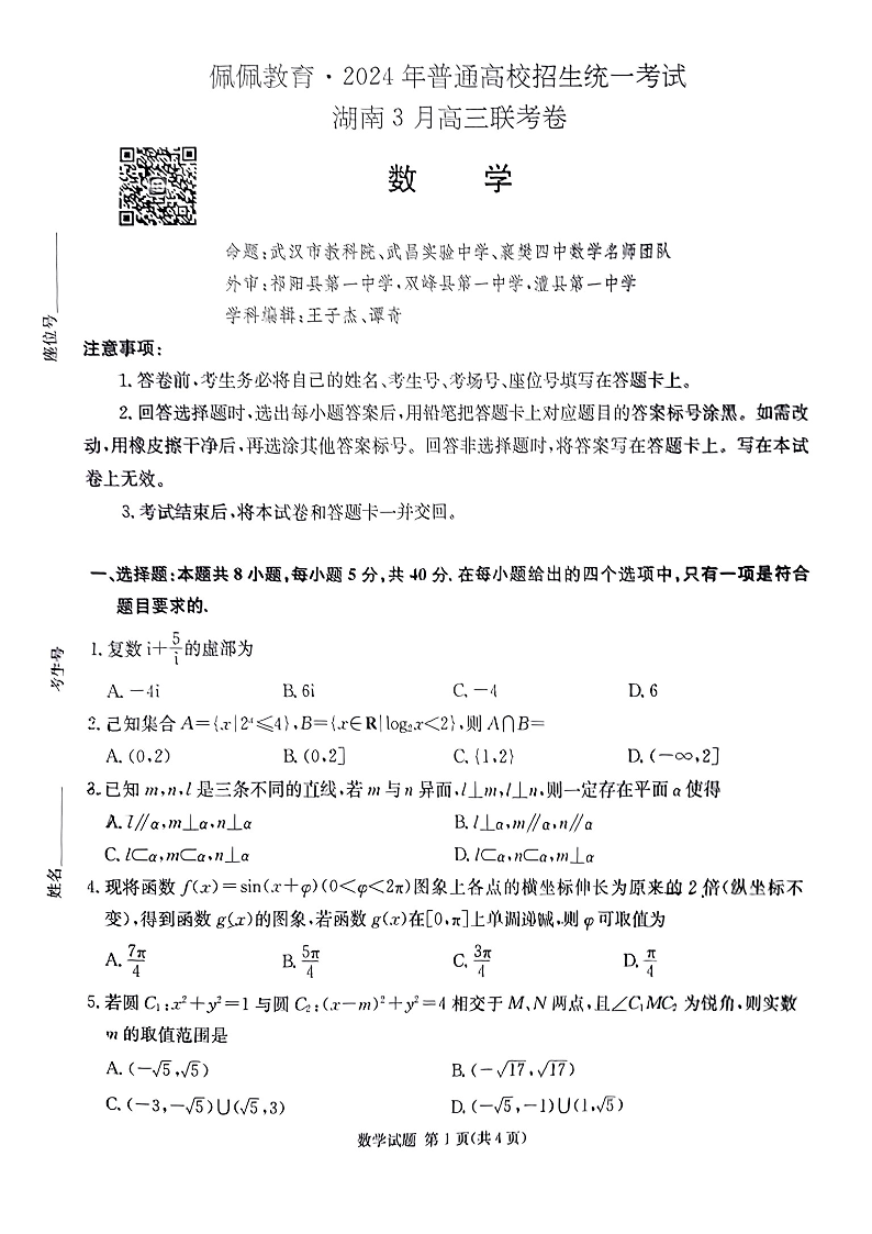 佩佩教育2024年普通高中学业水平选择性考试 湖南3月高三 联考卷 数学