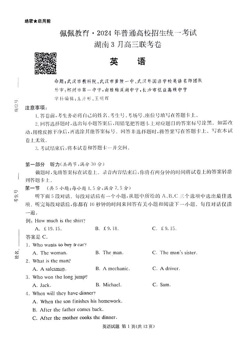 佩佩教育2024年普通高中学业水平选择性考试 湖南3月高三 联考卷 英语