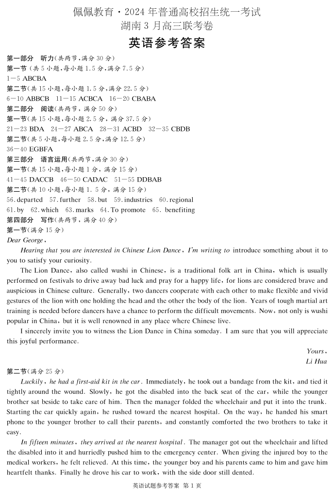 佩佩教育2024年普通高中学业水平选择性考试 湖南3月高三 联考卷 英语答案