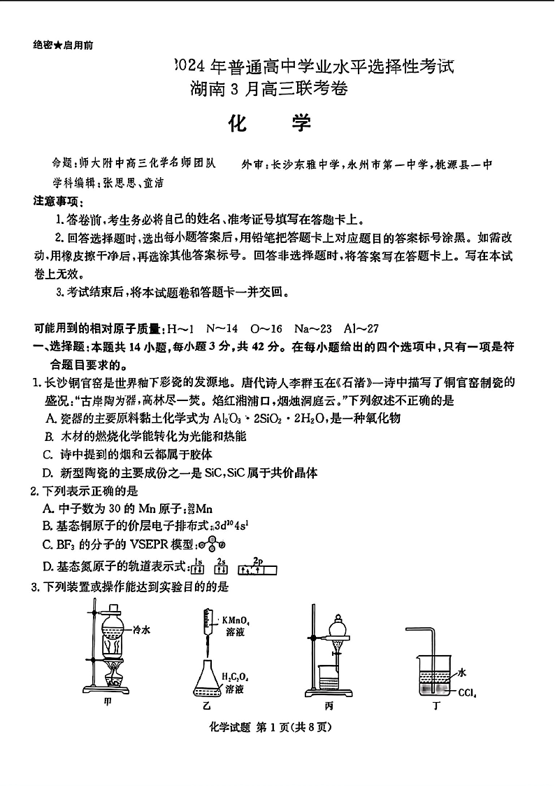 佩佩教育2024年普通高中学业水平选择性考试 湖南3月高三 联考卷 化学