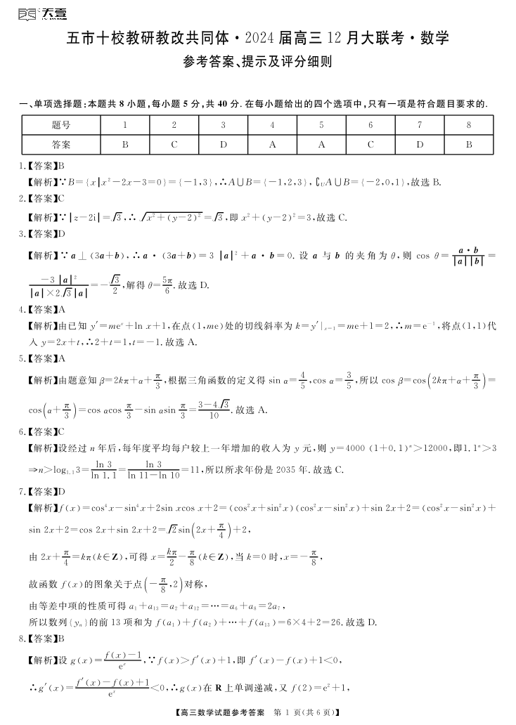 天壹联盟·五市十校教研教改共同体·2024届高三12月大联考 数学答案