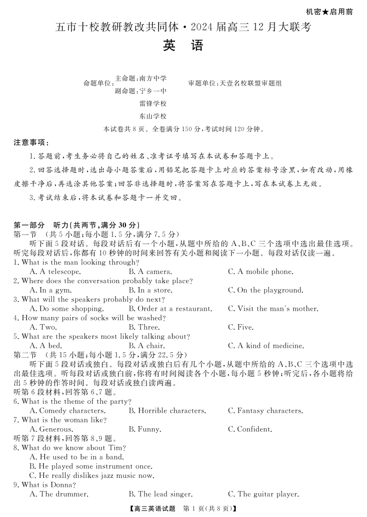 天壹联盟·五市十校教研教改共同体·2024届高三12月大联考 英语