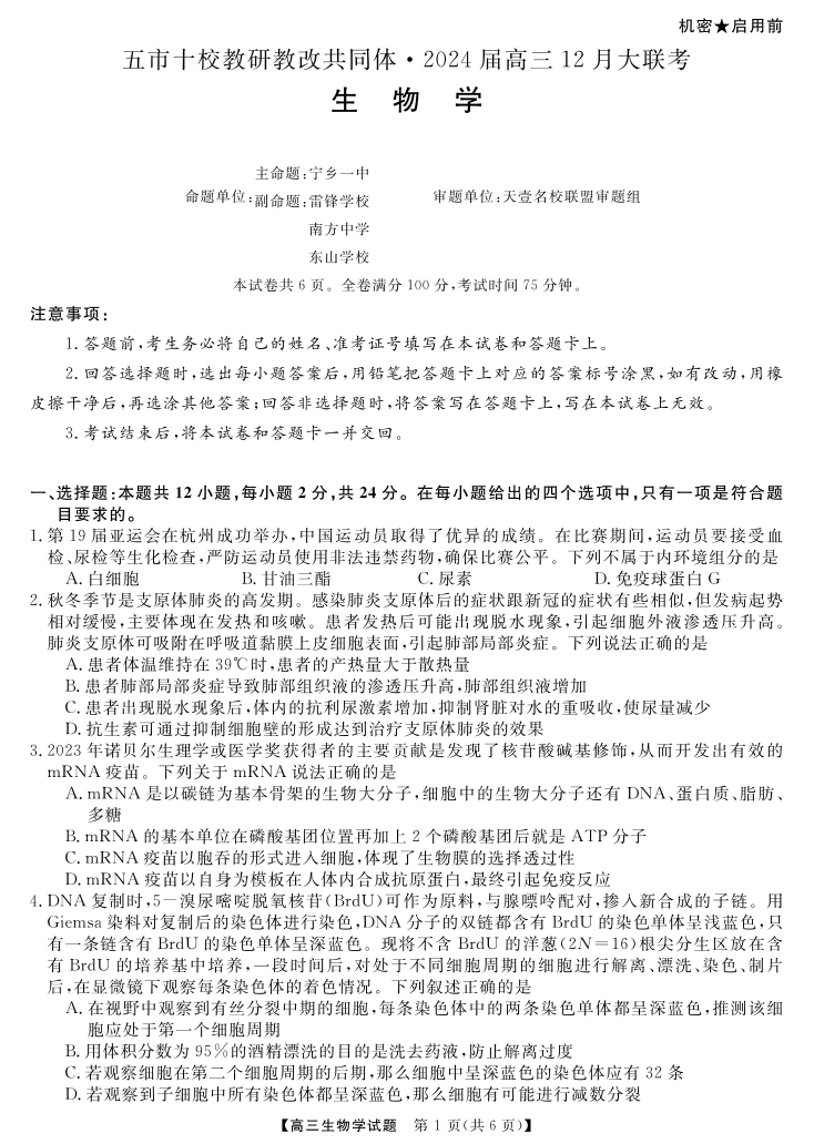 天壹联盟·五市十校教研教改共同体·2024届高三12月大联考 生物