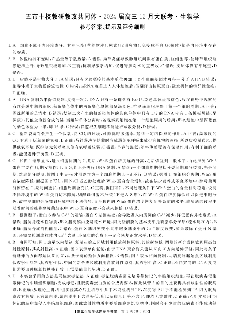 天壹联盟·五市十校教研教改共同体·2024届高三12月大联考 生物答案