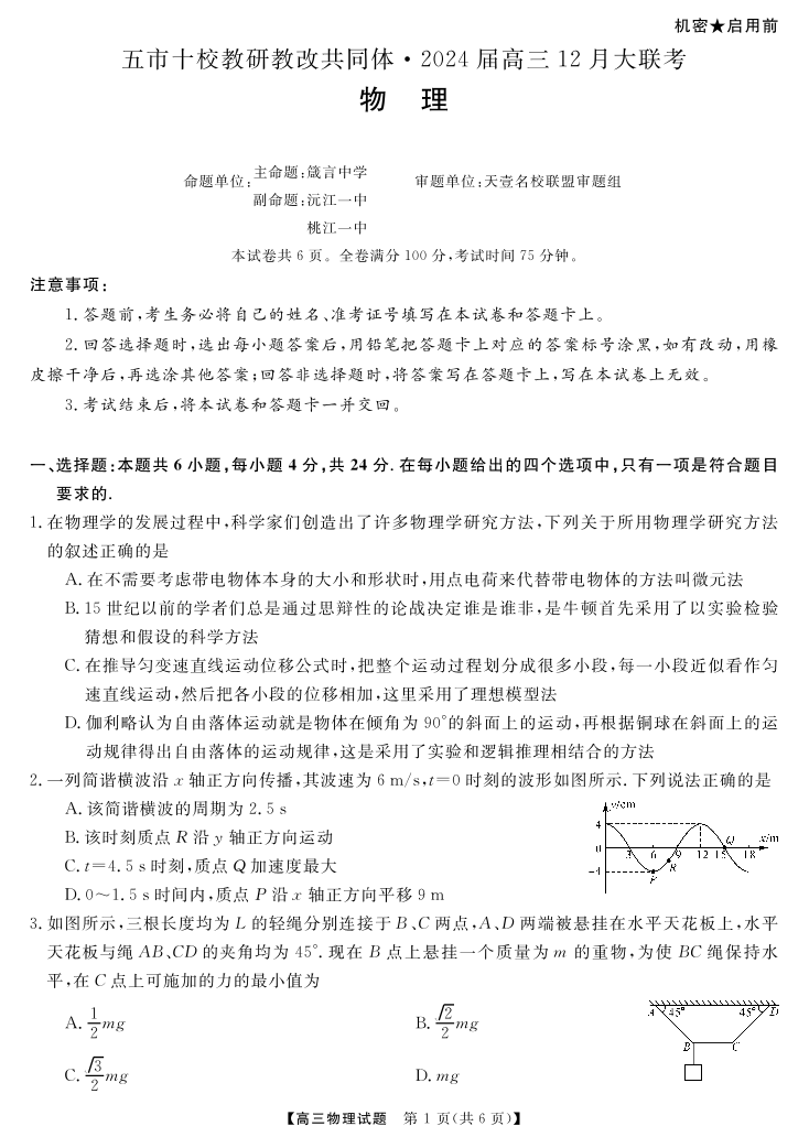 天壹联盟·五市十校教研教改共同体·2024届高三12月大联考 物理