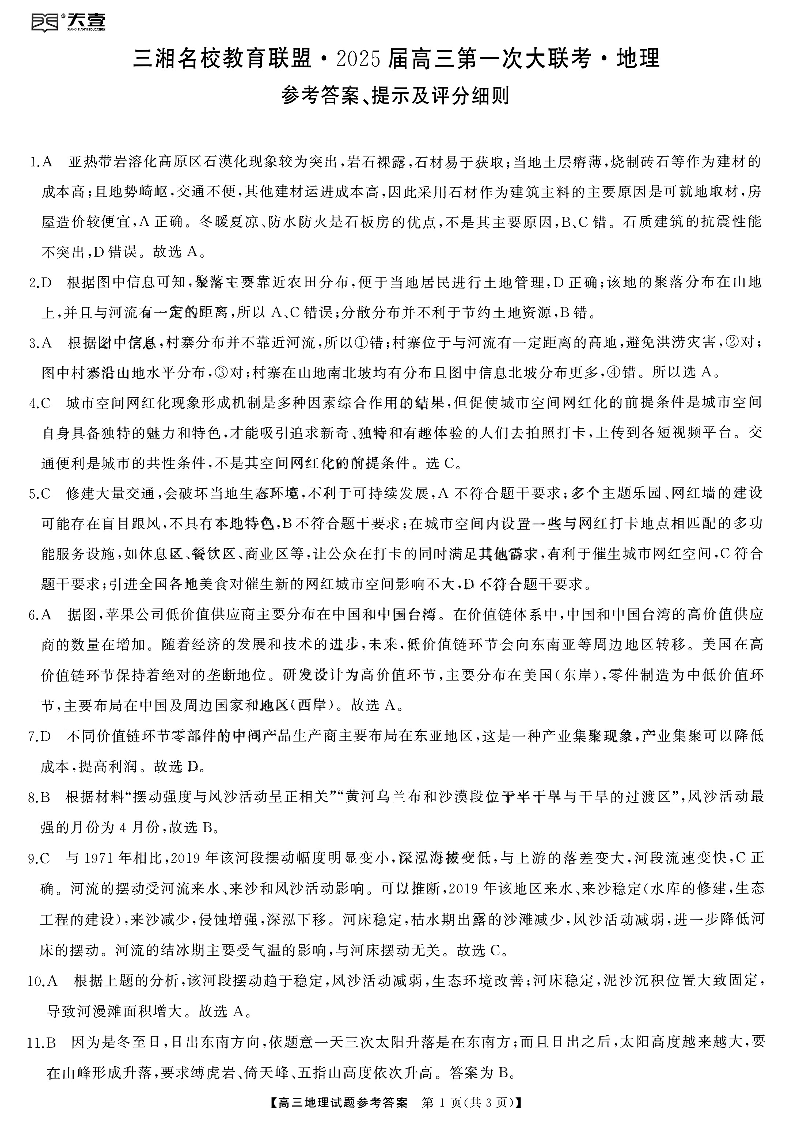 天壹名校联盟&三湘名校教育联盟2025届高三第一次联考+地理答案