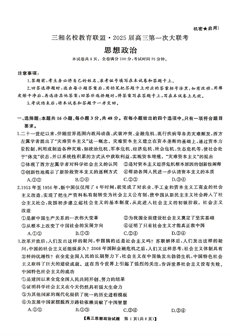 天壹名校联盟&三湘名校教育联盟2025届高三第一次联考+政治