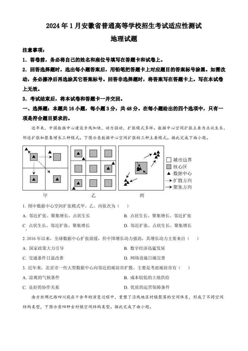 【地理试题+答案】安徽版2024年九省联考