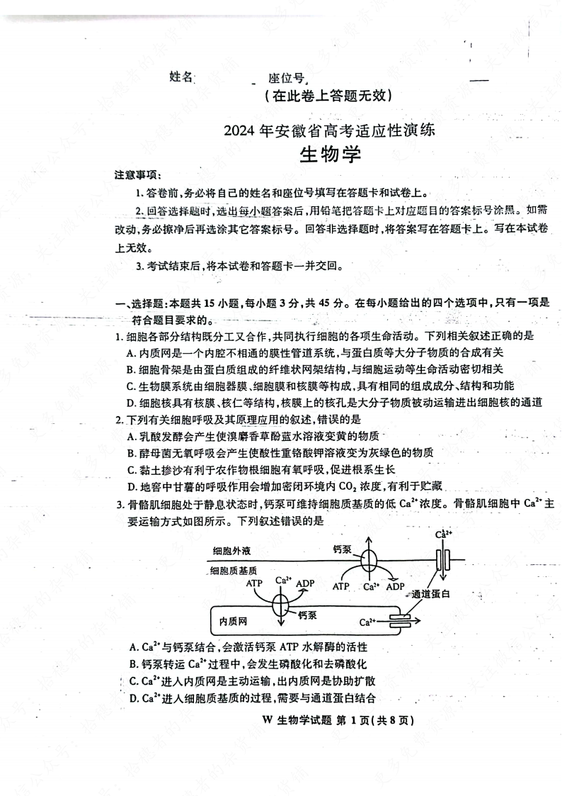 【生物】安徽版2024年九省联考