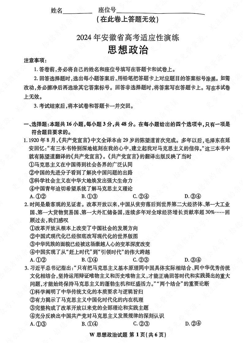 【政治】安徽版2024年九省联考