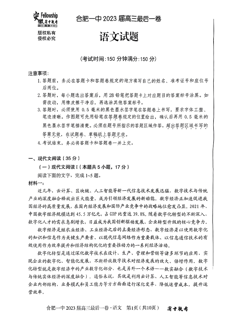 安徽省合肥市第一中学2023届高三最后一卷 语文