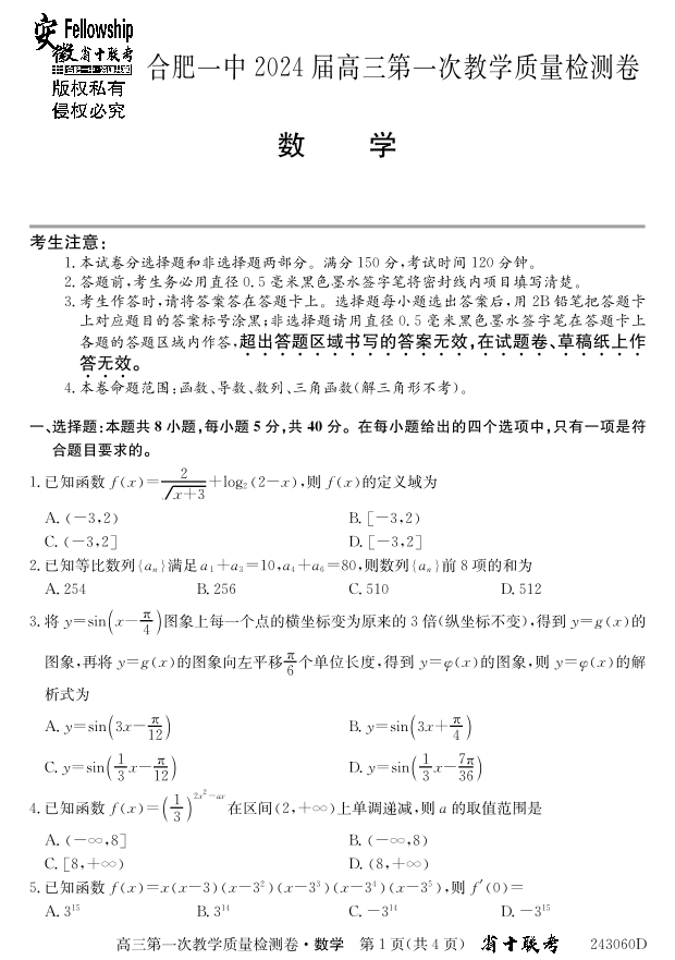 安徽省合肥市第一中学2023-2024学年高三上学期第一次教学质量检测 数学