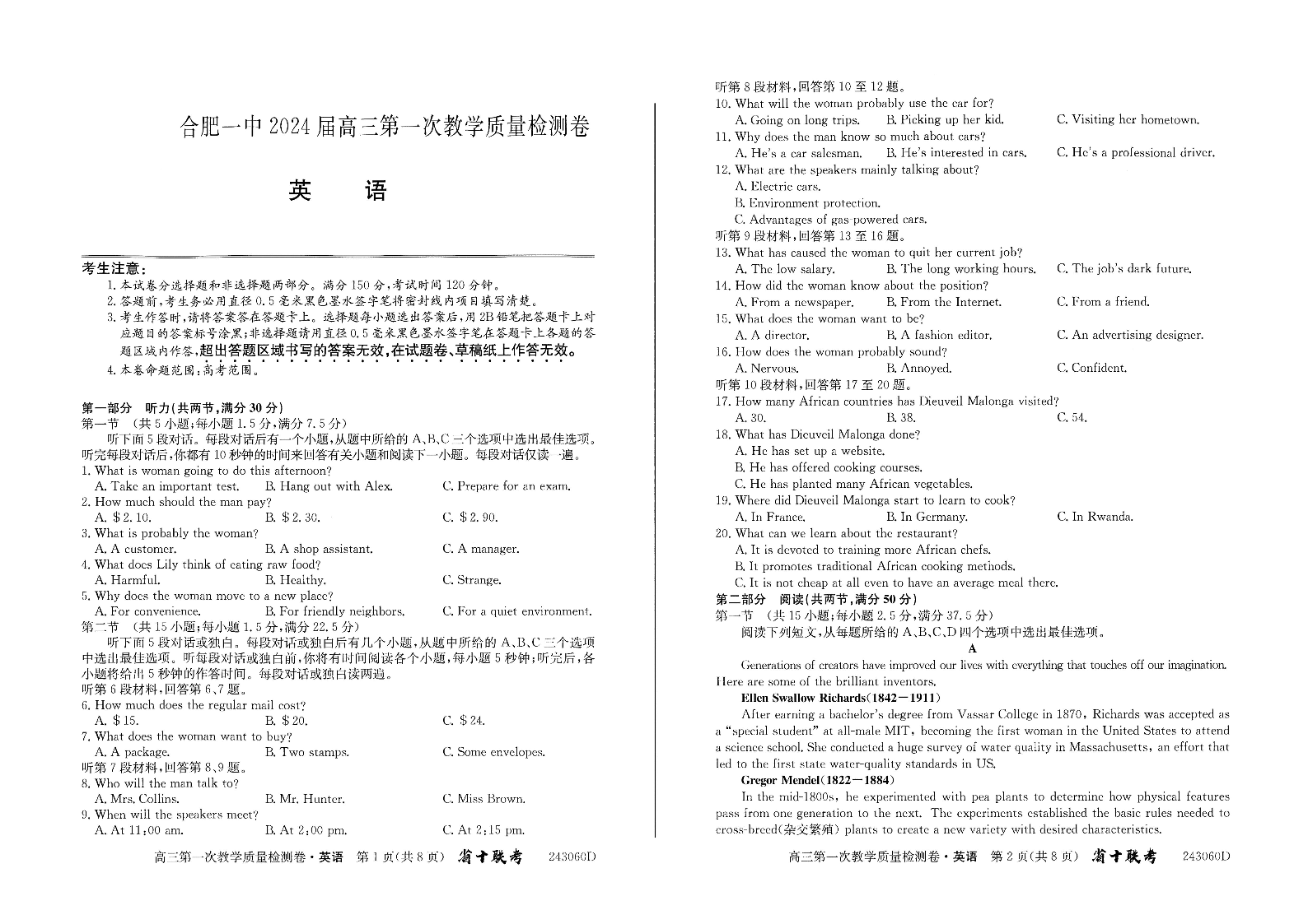 安徽省合肥市第一中学2023-2024学年高三上学期第一次教学质量检测 英语