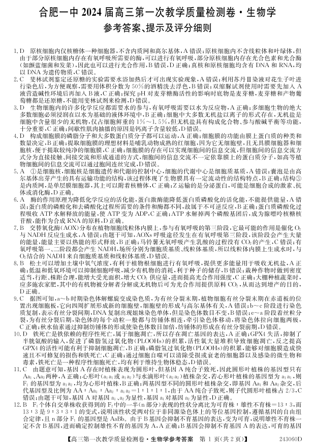 安徽省合肥市第一中学2023-2024学年高三上学期第一次教学质量检测 生物答案