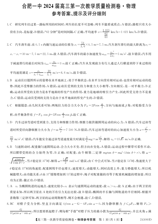安徽省合肥市第一中学2023-2024学年高三上学期第一次教学质量检测 物理答案
