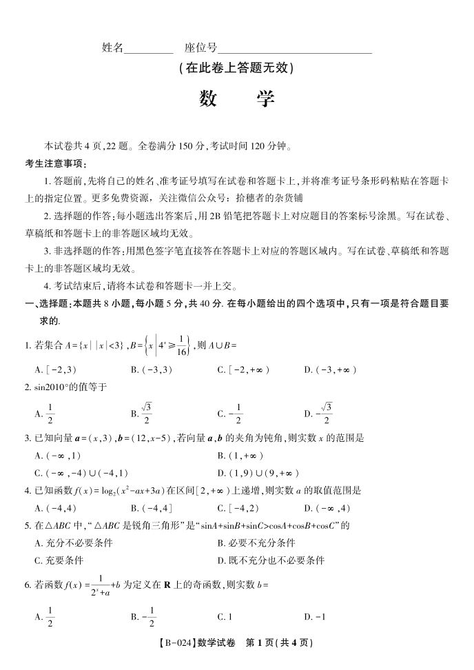 安徽皖江名校联盟2024届高三上学期10月阶段考试 数学