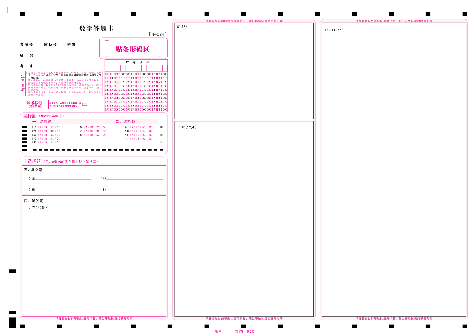 安徽皖江名校联盟2024届高三上学期10月阶段考试 数学答案卡
