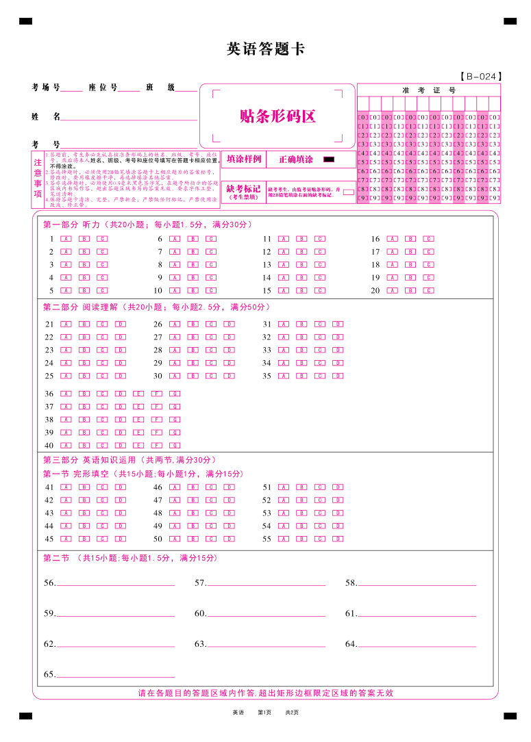 安徽皖江名校联盟2024届高三上学期10月阶段考试 英语答题卡