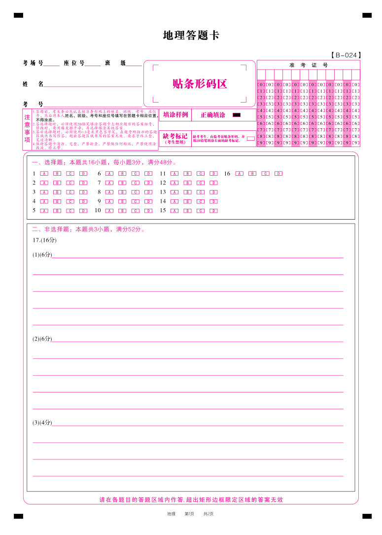 安徽皖江名校联盟2024届高三上学期10月阶段考试 地理答题卡
