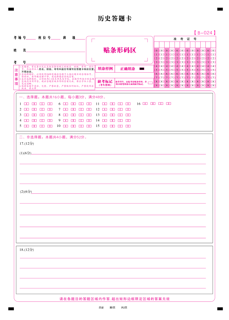 安徽皖江名校联盟2024届高三上学期10月阶段考试 历史答题卡
