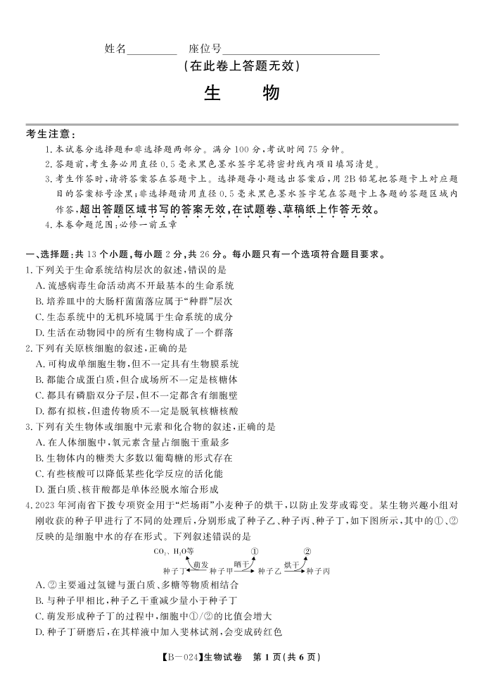 安徽皖江名校联盟2024届高三上学期10月阶段考试 生物