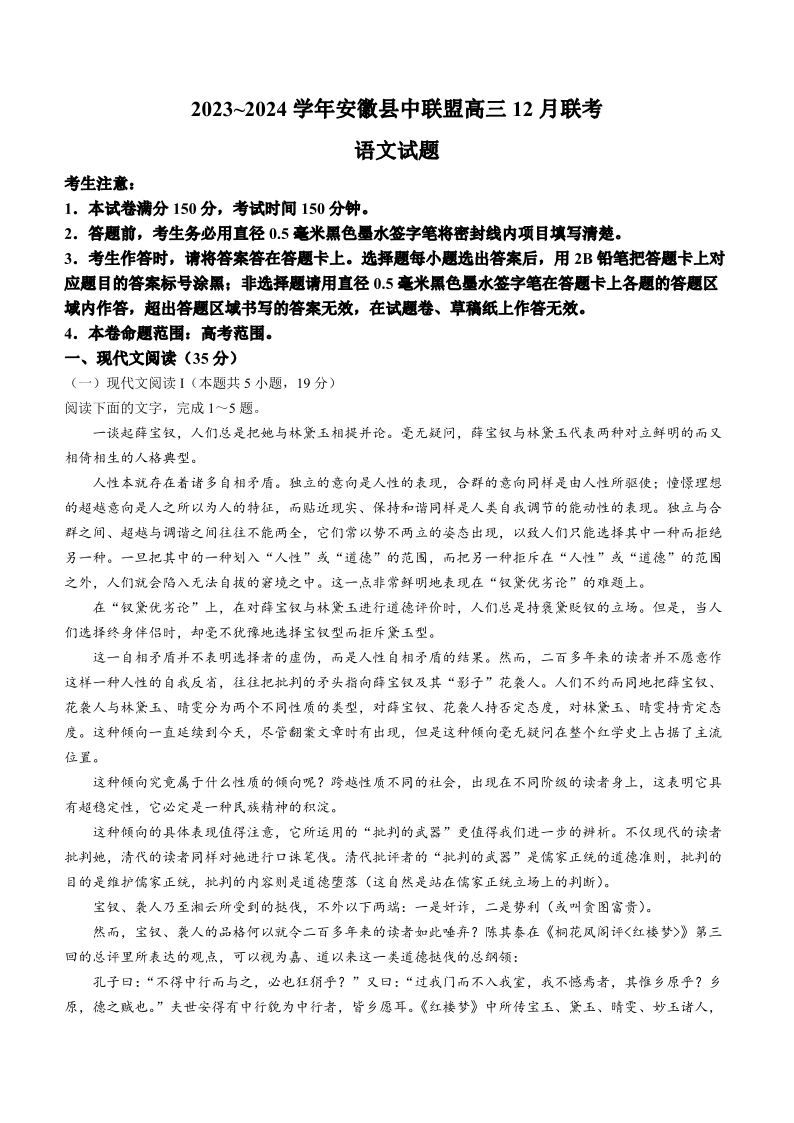 安徽省县中联盟2023-2024学年高三上学期12月联考 语文