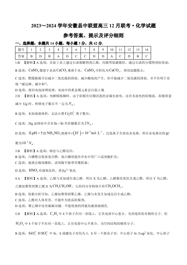 安徽省县中联盟2023-2024学年高三上学期12月联考 化学答案