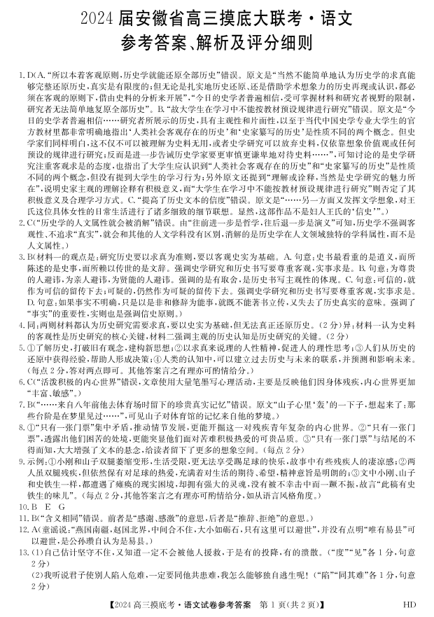 安徽省皖南八校2024届高三上学期8月摸底大联考 语文答案