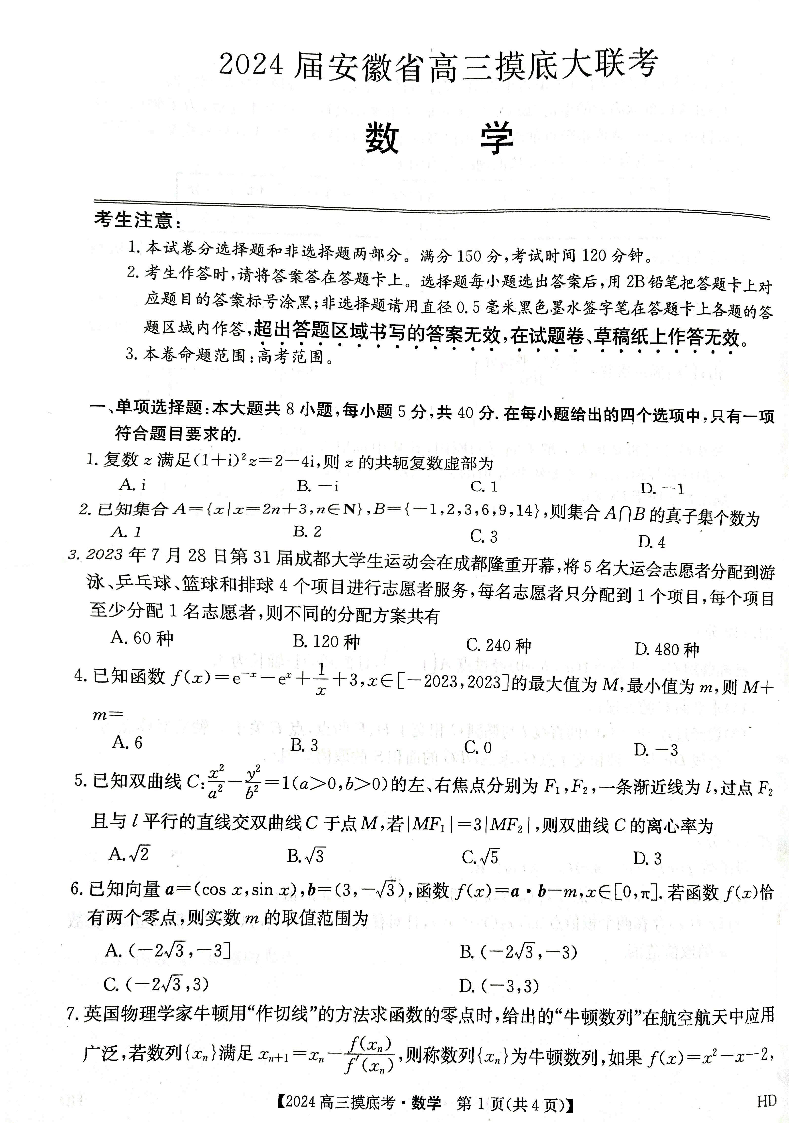 安徽省皖南八校2024届高三上学期8月摸底大联考 数学