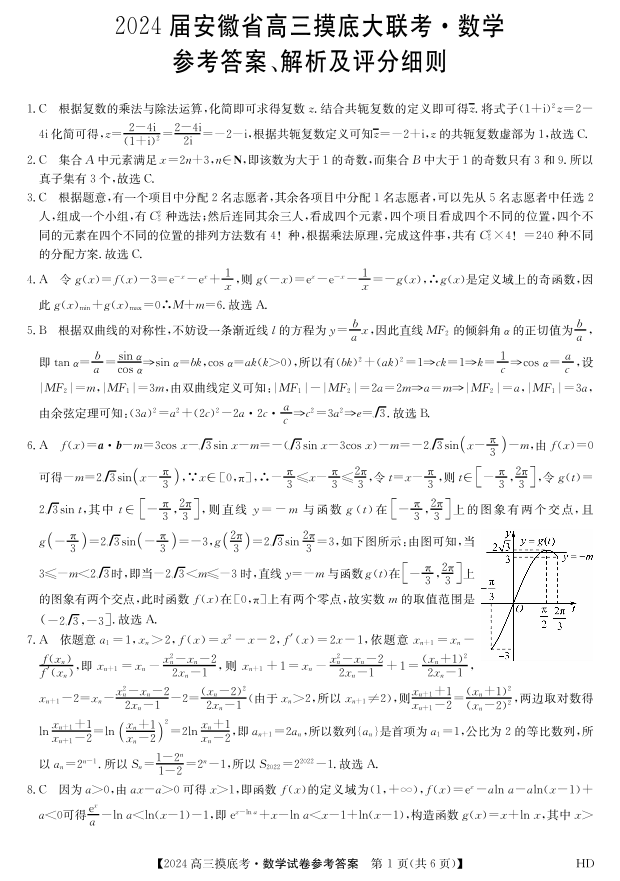安徽省皖南八校2024届高三上学期8月摸底大联考 数学答案