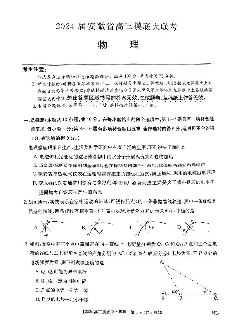 安徽省皖南八校2024届高三上学期8月摸底大联考 物理