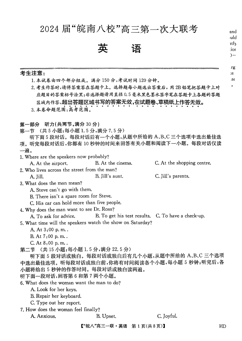 安徽省皖南八校2023-2024学年高三上学期第一次大联考 英语