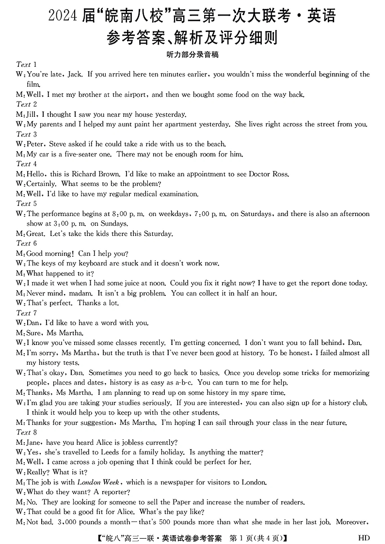 安徽省皖南八校2023-2024学年高三上学期第一次大联考 英语答案