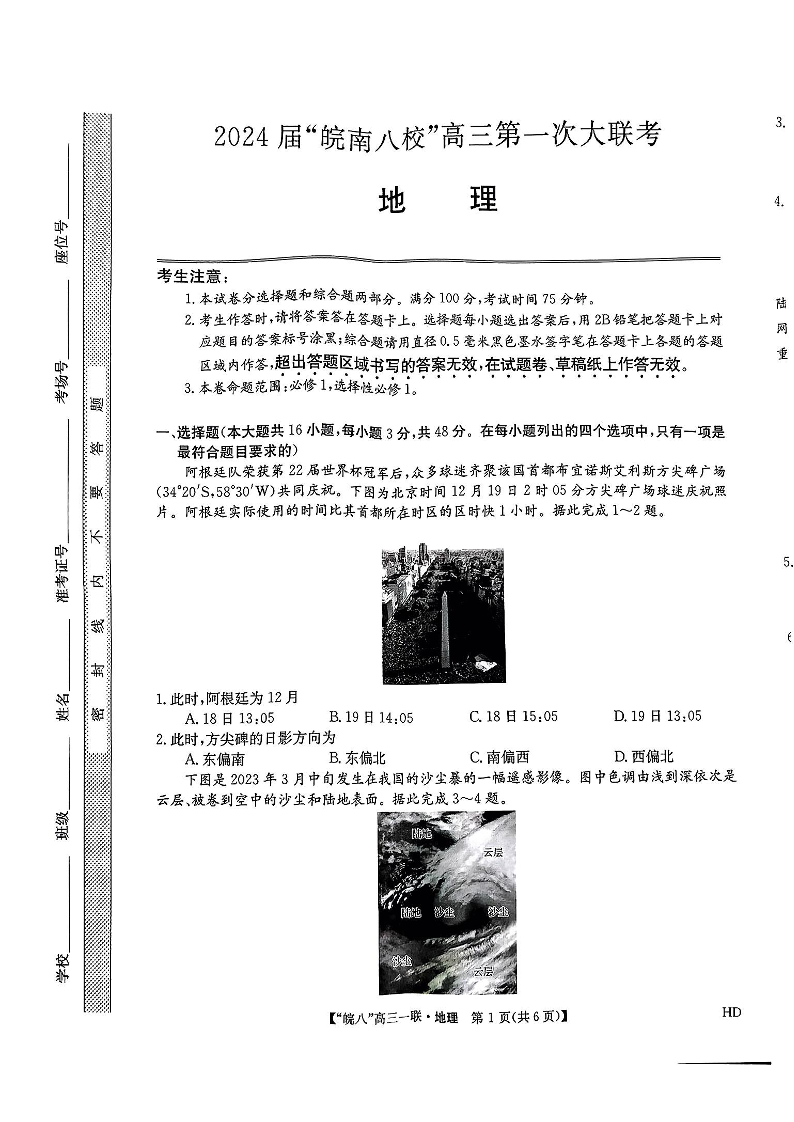 安徽省皖南八校2023-2024学年高三上学期第一次大联考 地理
