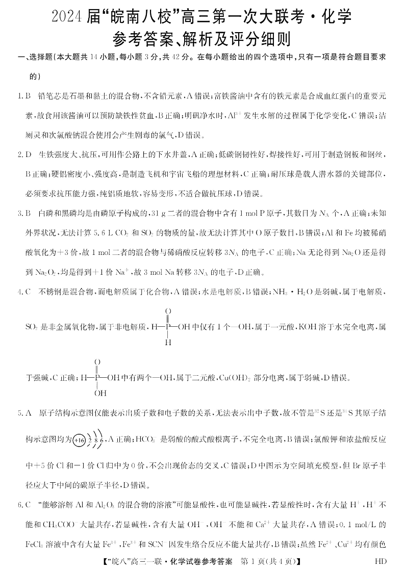 安徽省皖南八校2023-2024学年高三上学期第一次大联考 化学答案