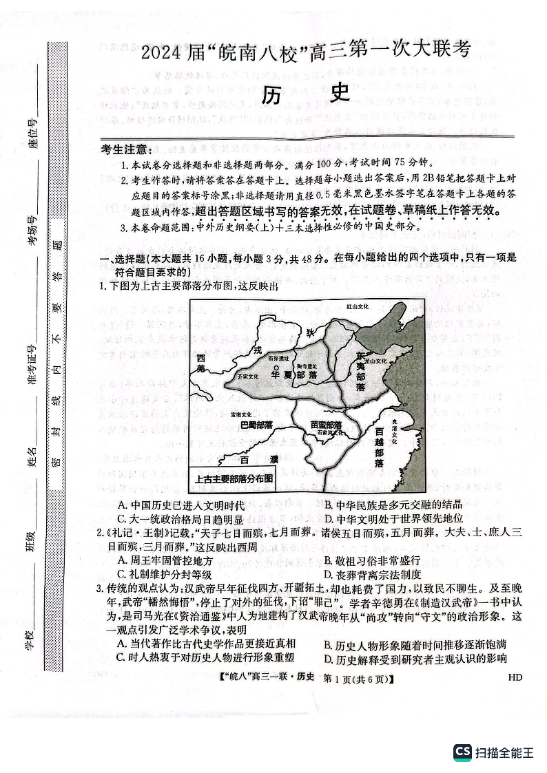 安徽省皖南八校2023-2024学年高三上学期第一次大联考 历史