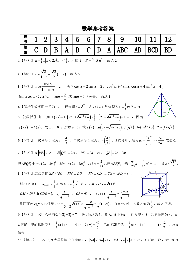 安徽省皖江名校联盟2024届高三开学摸底考试 数学答案