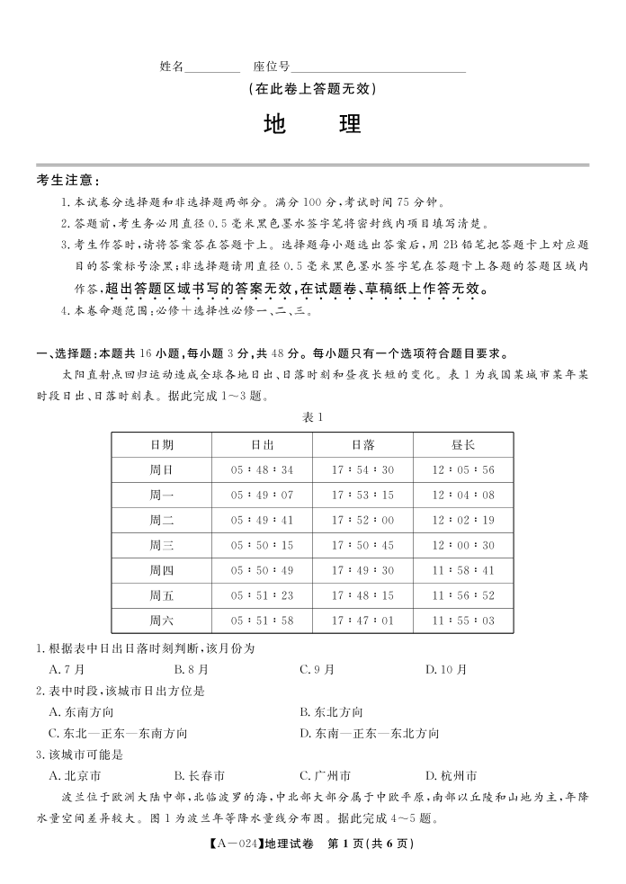 安徽省皖江名校联盟2024届高三开学摸底考试 地理
