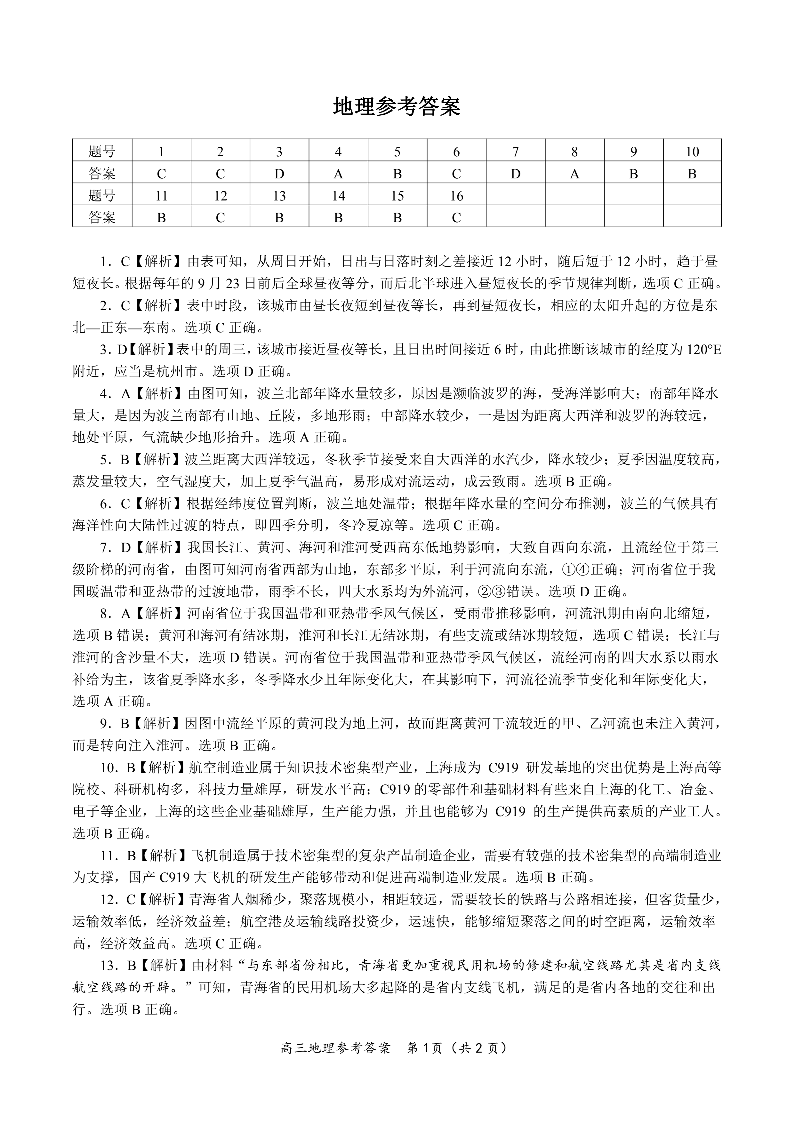 安徽省皖江名校联盟2024届高三开学摸底考试 地理答案